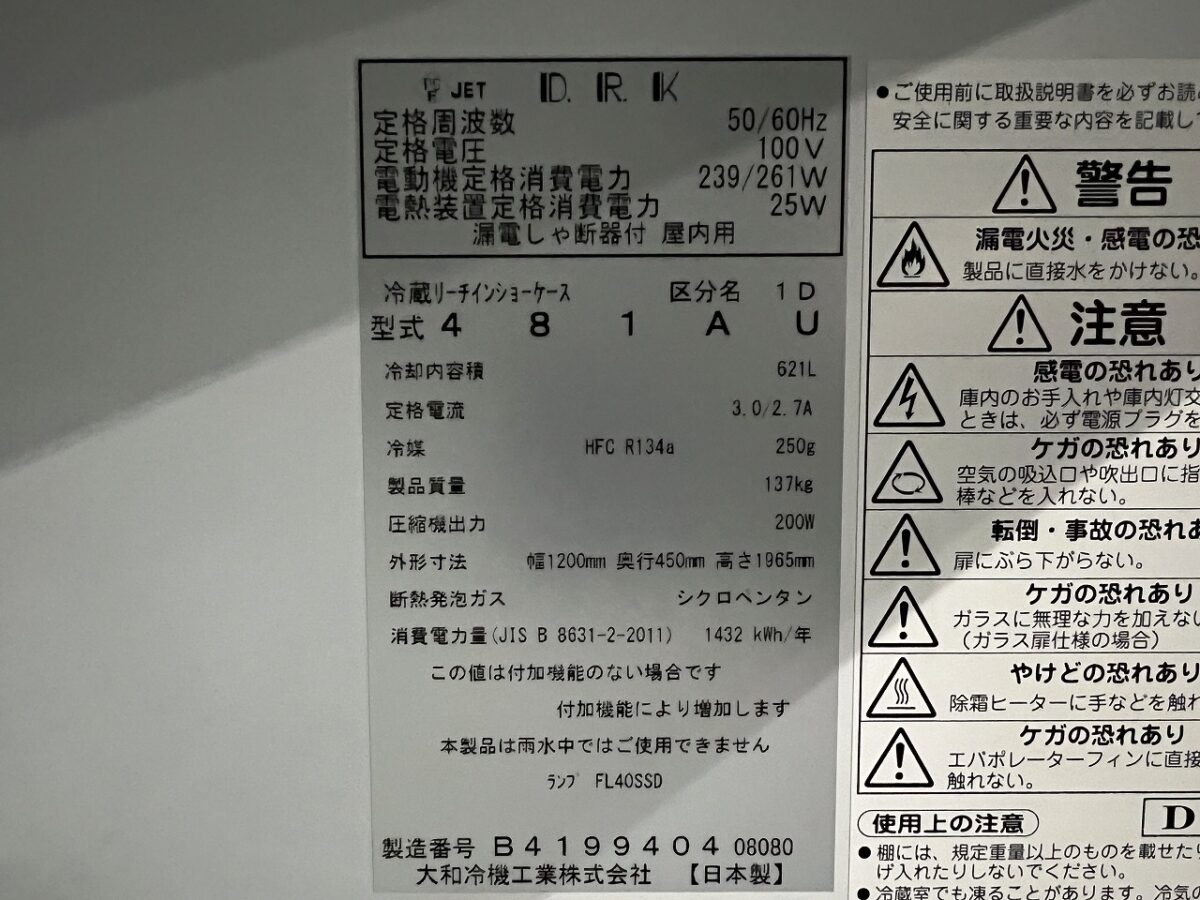 2020年 冷蔵リーチインショーケース 幅1200×奥行450 大和冷機 481AU 業務用 厨房機器